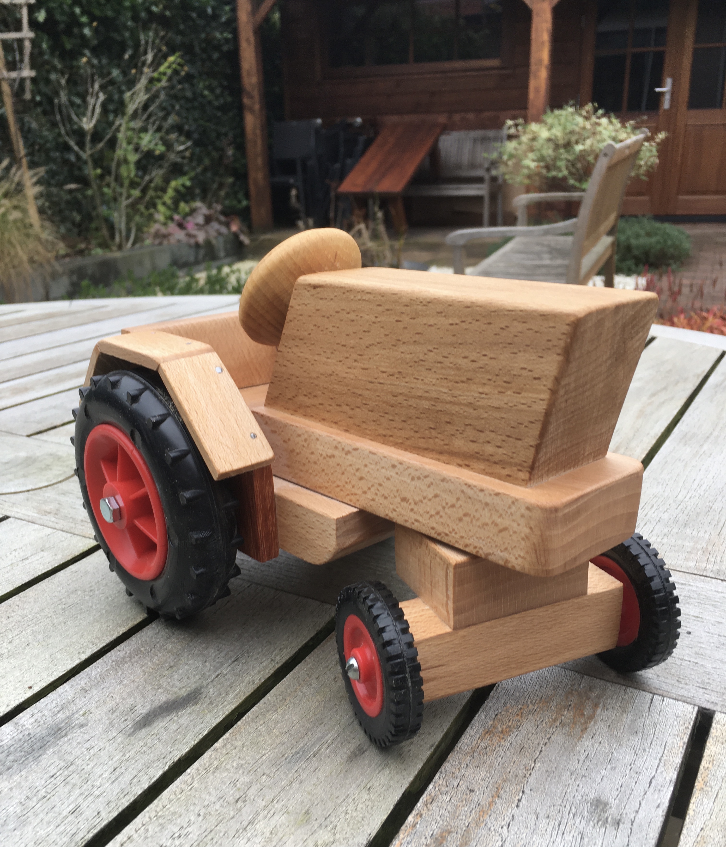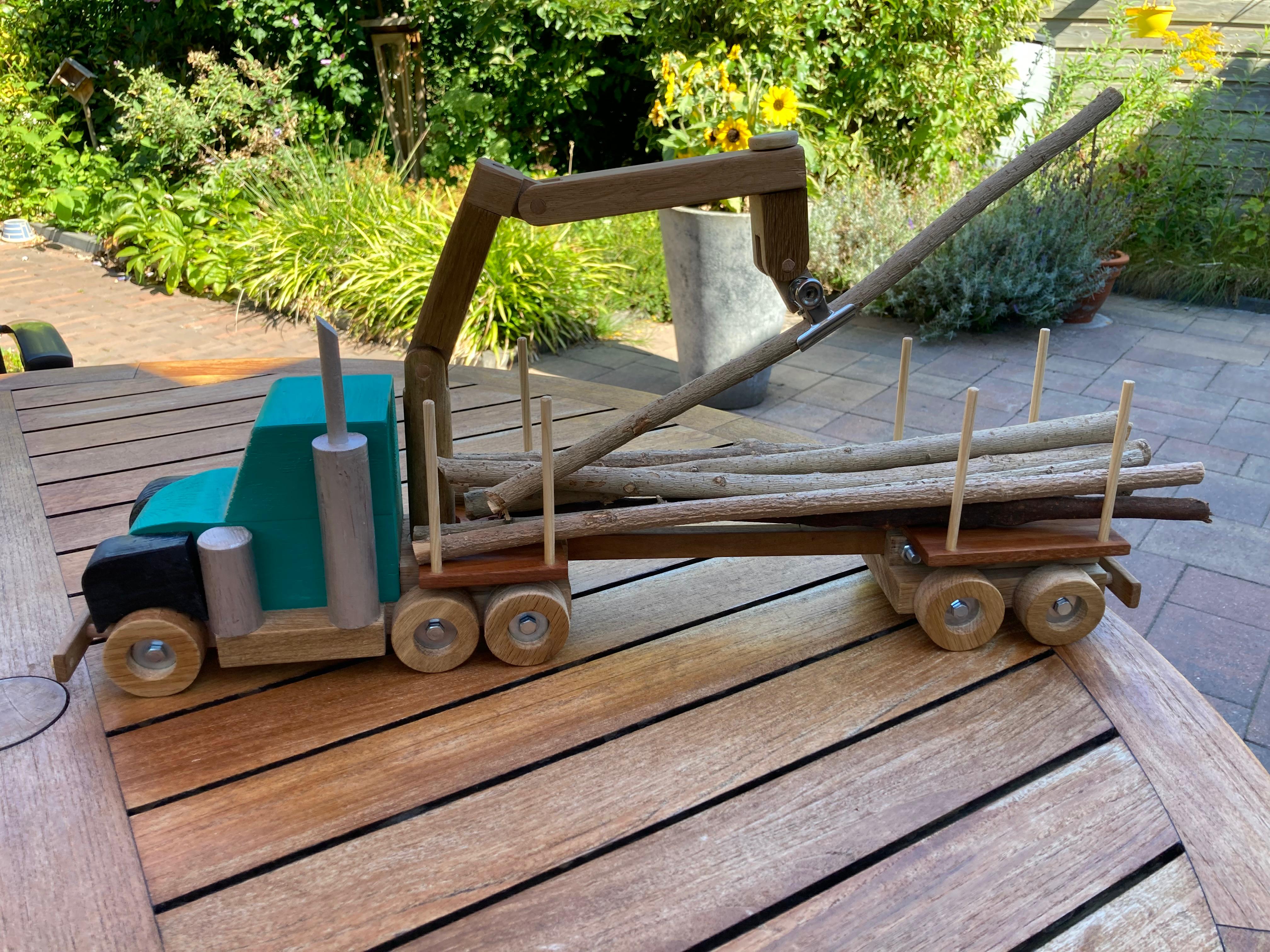 Als mijn kleinkinderen op bezoek komen, rennen ze meteen naar het hoekje waar het houten speelgoed staat. Dat heeft duidelijk een grote aantrekkingskracht. Ik maak het speelgoed altijd zo dat ze er echt iets mee kunnen. Een goed voorbeeld is de boomstammenauto hieronder. De kinderen kunnen eindeloos bezig zijn de stammen op en af te laden.
